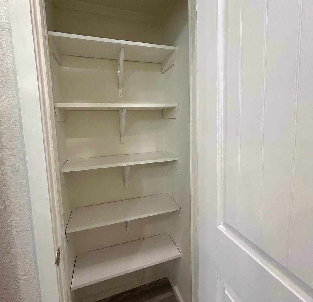 – Built-in queen-sized platform bed with shiplap headboard and underbed storage drawers, offering both comfort and practicality.